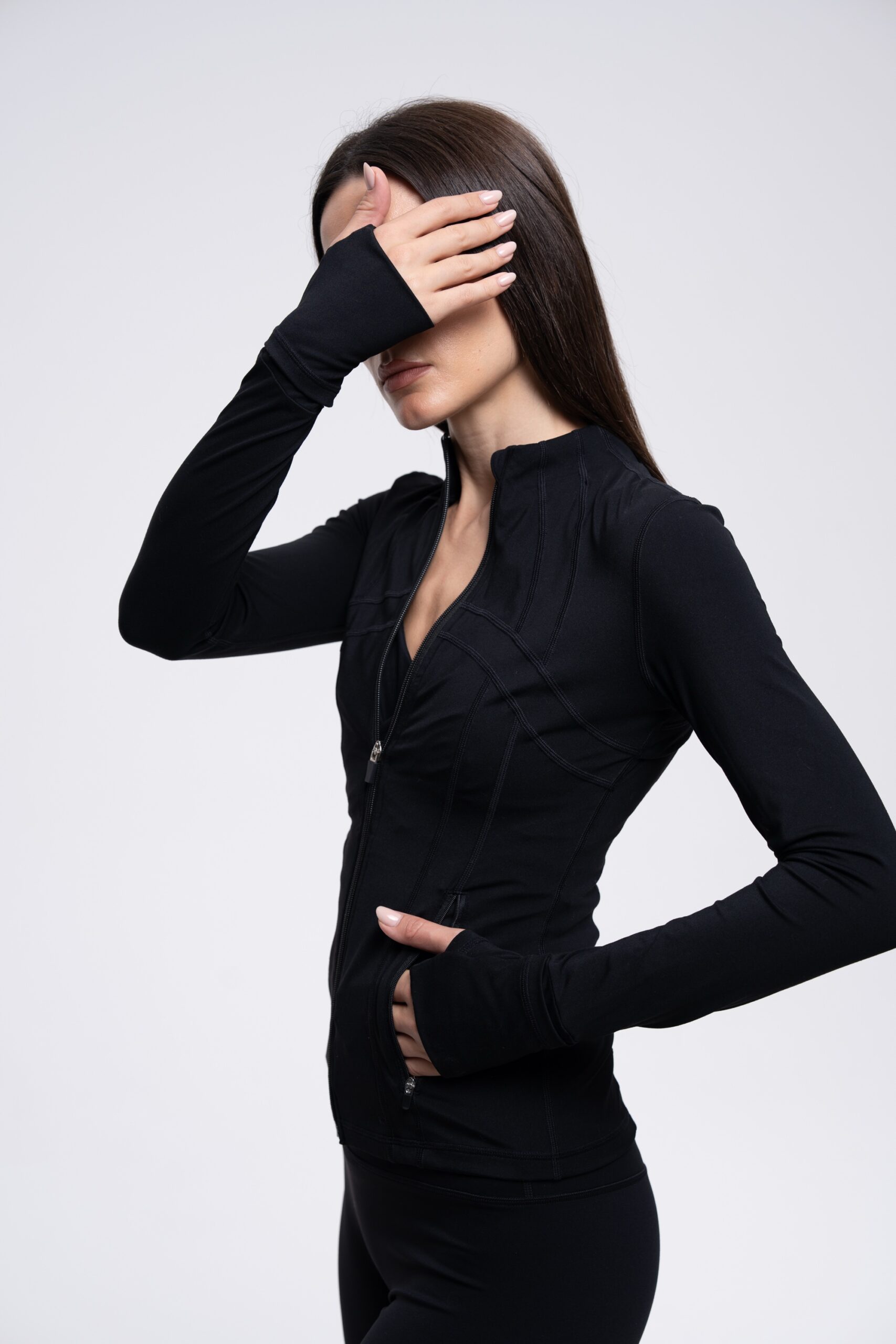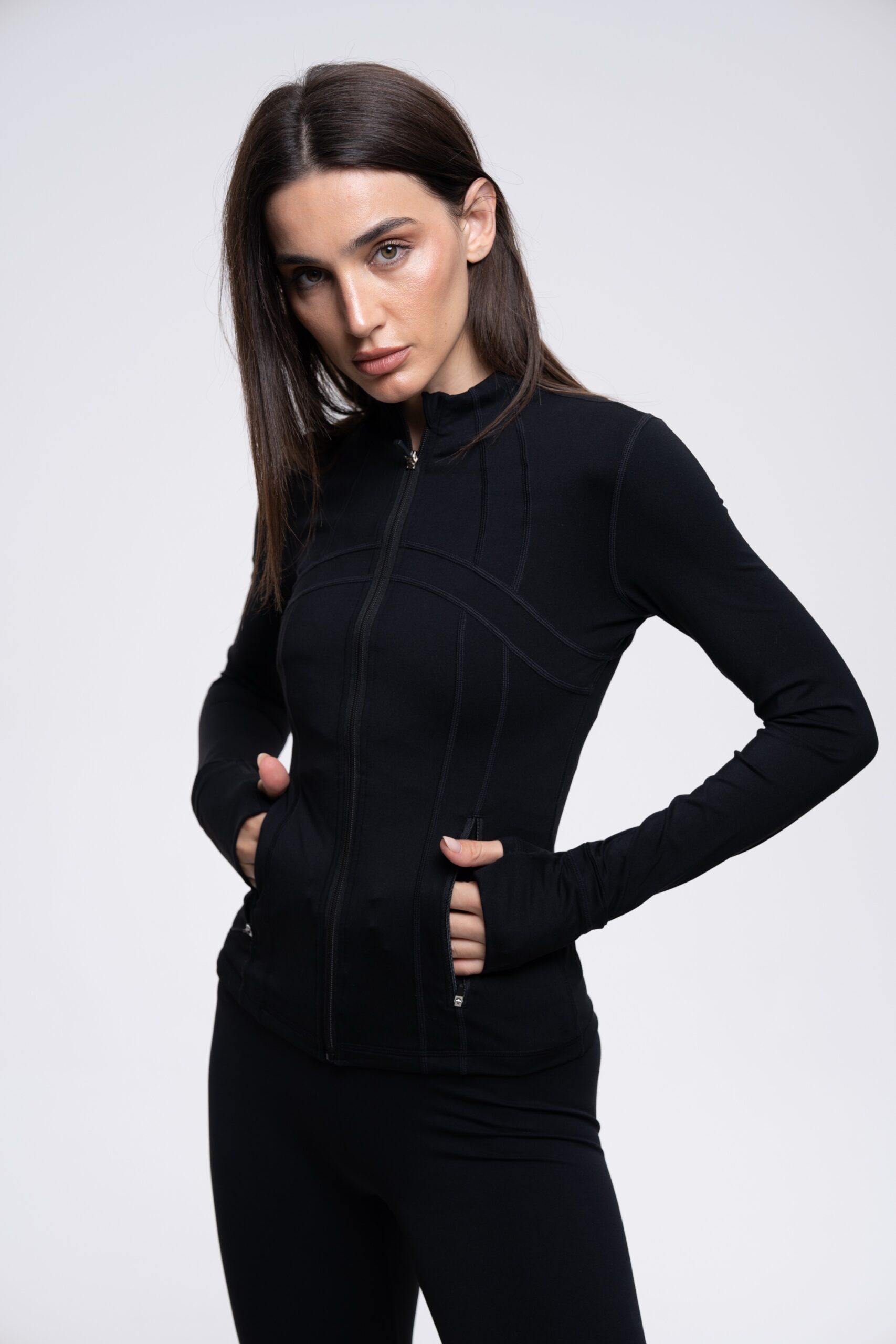 The sculpt jacket is your go to layer for training and beyond. designed with a contouring fit, thumb-hole sleeves, and lightweight stretch fabric, it moves seamlessly with your body while accentuating your shape. you can wear it to the gym or as an everyday statement piece.